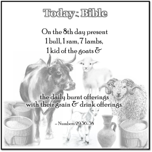 On the eighth day you shall have a sacred assembly. You shall do no customary work. You shall present a burnt offering, an offering made by fire as a sweet aroma to the LORD: one bull, one ram, seven lambs in their first year without blemish, and their grain offering and their drink offerings for the bull, for the ram, and for the lambs, by their number, according to the ordinance; also one goat as a sin offering, besides the regular burnt offering, its grain offering, and its drink offering.