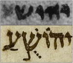 This is the name Yehoshua (Joshua); Joshua means “The LORD Saves.” The top image was written ~2,000 years ago and was found among the Dead Sea Scrolls. The bottom image was written ~1,000 years ago and is from the Aleppo Codex (the Crown of Aleppo). The top image was written on a scroll, possibly in Qumran, near the Dead Sea. The bottom is in a bound manuscript, written in Tiberias, near the Sea of Galilee, which later made its way to Aleppo (Syria). The Aleppo Codex is now housed in the Shrine of the Book alongside the Dead Sea Scrolls.