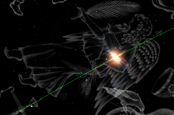On the biblical calendar, a month is aligned with the lunar cycle. The first visible sliver of the Moon is the first day of the month. In our image above, the Moon is in that phase. Because of this, we know that this image can be dated to the first day of the biblical month. The Sun moves through the constellation of Virgo every year in the September/October timeframe. This coincides with the months of Tishrei (the 7th month) or Cheshvan (the 8th month).