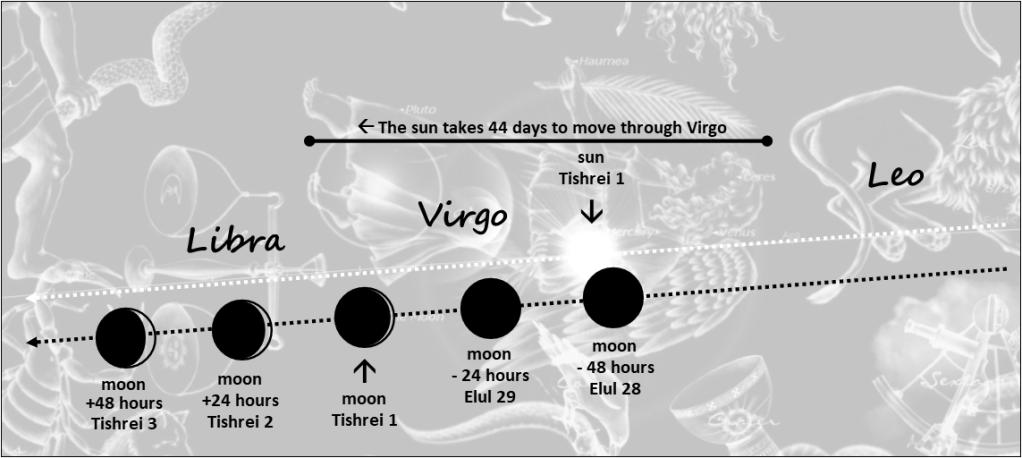 It takes the Sun 44 days to completely move through Virgo. With the Sun in this position, it normally means the first day of the month of Tishrei. The first day of Tishrei is the date for the Appointed Time of the “Feast of Trumpets.” In this day and age, the “Feast of Trumpets” is commonly referred to as “Rosh Hashanah.” Rosh = “head, beginning.” Hashanah = “of the year” as it is considered to be the first day of the new biblical year.