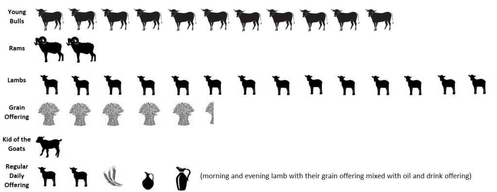 On the third day present eleven bulls, two rams, fourteen lambs in their first year without blemish, and their grain offering and their drink offerings for the bulls, for the rams, and for the lambs, by their number, according to the ordinance; also one goat as a sin offering, besides the regular burnt offering, its grain offering, and its drink offering. – Numbers 29:20-22 (NKJ)