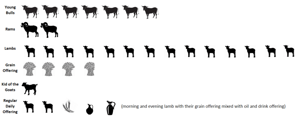 On the seventh day present seven bulls, two rams, and fourteen lambs in their first year without blemish, and their grain offering and their drink offerings for the bulls, for the rams, and for the lambs, by their number, according to the ordinance; also one goat as a sin offering, besides the regular burnt offering, its grain offering, and its drink offering. – Numbers 29:32-34 (NKJ