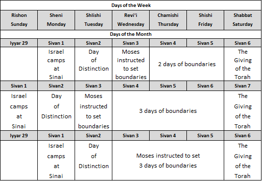 We are in the days leading up to Shavu’ot (aka Feast of Weeks or Pentecost). It has long been recognized as the day God gave Israel the covenant at Mount Sinai…the Ten Commandments. There have been disagreements on the dating of these events. We know that Israel arrived on the first day of the third month because the Bible tells us so. Some have taught that the Ten Commandments were given on the 7th day, but the majority of Israel observes the 6th day. One school of thought teaches that there were two days of boundaries and another, three days. The calendar widely observed today came together as a way of reconciling these opposing points of view so that there would be shalom…peace…unity. The chart below visualizes how we understand the conflict and the solution.