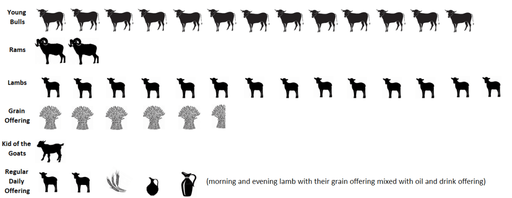 `You shall present a burnt offering, an offering made by fire as a sweet aroma to the LORD: thirteen young bulls, two rams, and fourteen lambs in their first year. They shall be without blemish. Their grain offering shall be of fine flour mixed with oil: three-tenths of an ephah for each of the thirteen bulls, two-tenths for each of the two rams, and one-tenth for each of the fourteen lambs; also one kid of the goats as a sin offering, besides the regular burnt offering, its grain offering, and its drink offering. – Numbers 29:12-16 (NKJ)