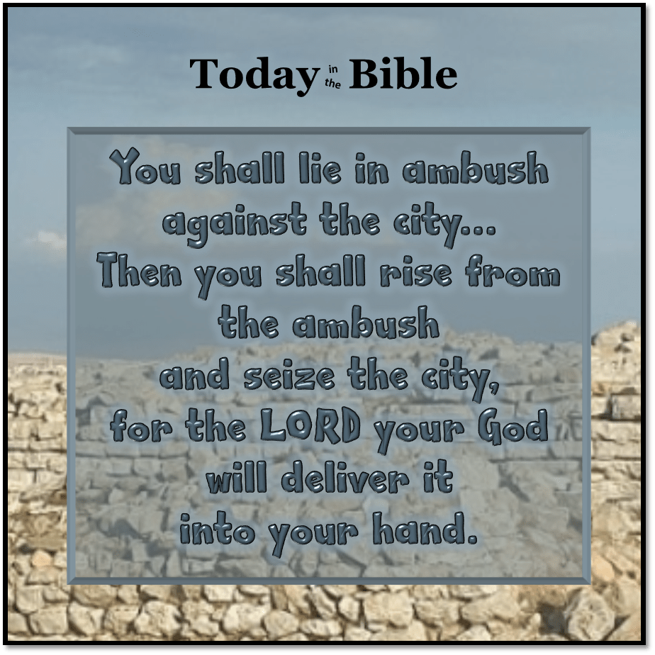 Today in the Bible, the LORD informs Joshua that now is the time to lay in ambush for Ai. We don’t have an exact date, but these events would have happened around this time of year…after entering the Promised Land on the tenth day of the first month, after celebrating Passover for the first time in the Land, and after the fall of Jericho. Let’s pick up where we left off yesterday.
