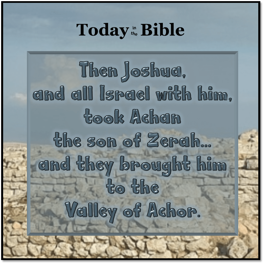 A few days ago, we remembered Joshua’s conquest of Jericho. The LORD had forbidden Israel from taking booty, however, one man fell prey to temptation. This transgression caused the problems that we’ve been reading about when Israel tried to conquer Ai. Today in the Bible, we’ll see how the LORD dealt with the transgression. Though we don’t have an exact date, it would have happened sometime around now. Let’s remember Achan and the trouble that occurred in the Valley of Achor.